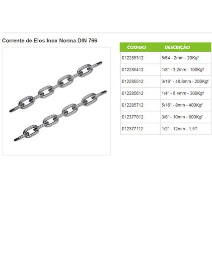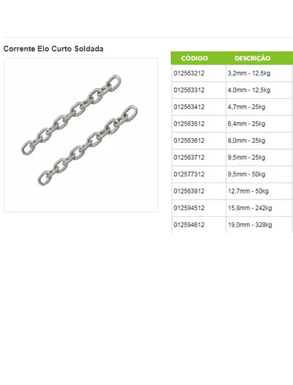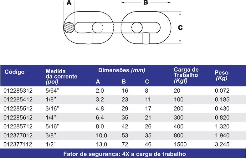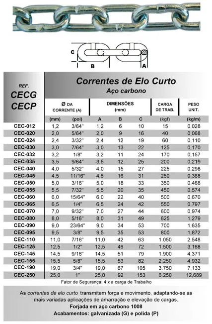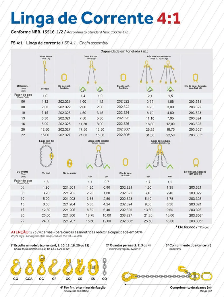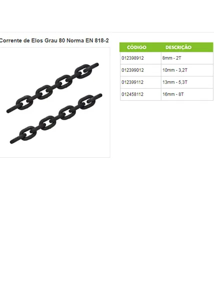 Fabricadas em aço liga (alloy steel) e conforme a norma EN 818-2, oferecem maior resistência mecânica e menor peso em comparação às correntes convencionais, garantindo segurança e praticidade no manuseio.